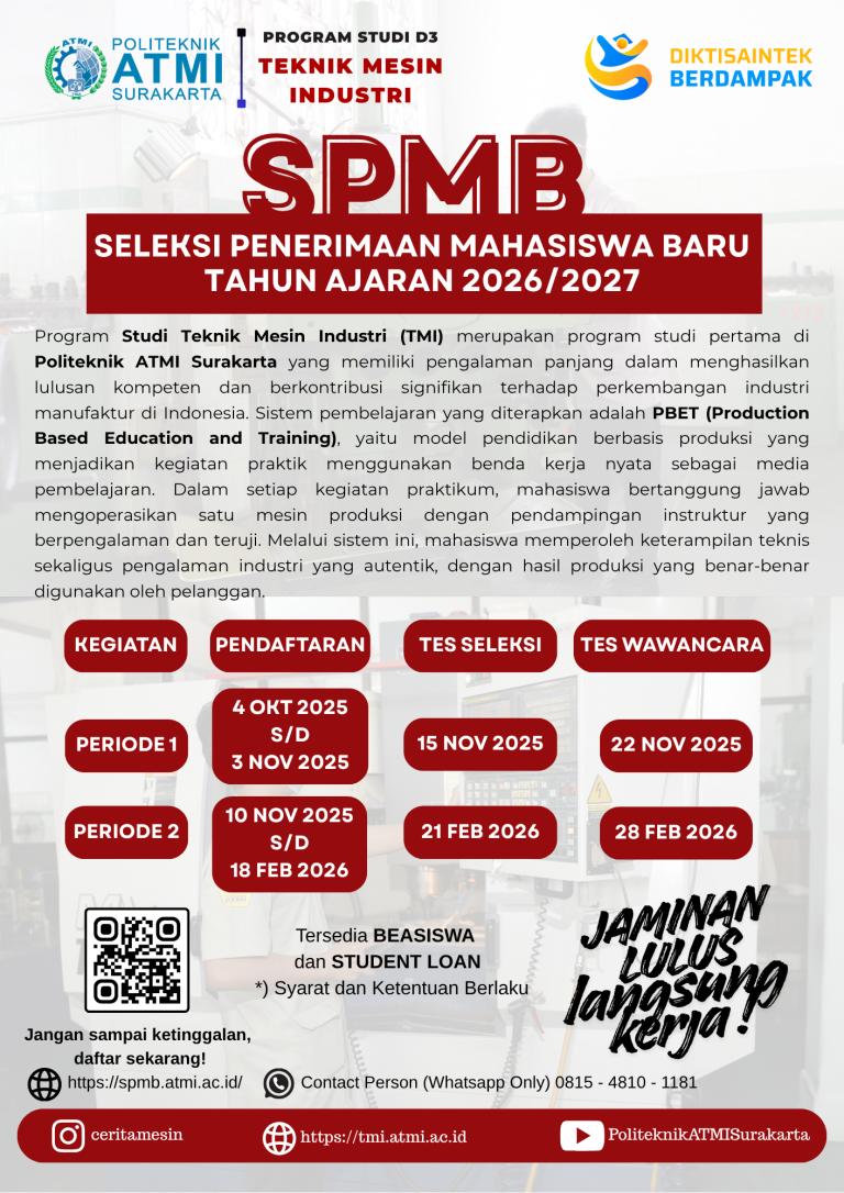 Selamat bergabung dengan Program Studi Diploma 3 Teknik Mesin Industri Politeknik ATMI Surakarta, representasi dunia industri manufaktur yang dikemas dengan pendidikan Vokasi.